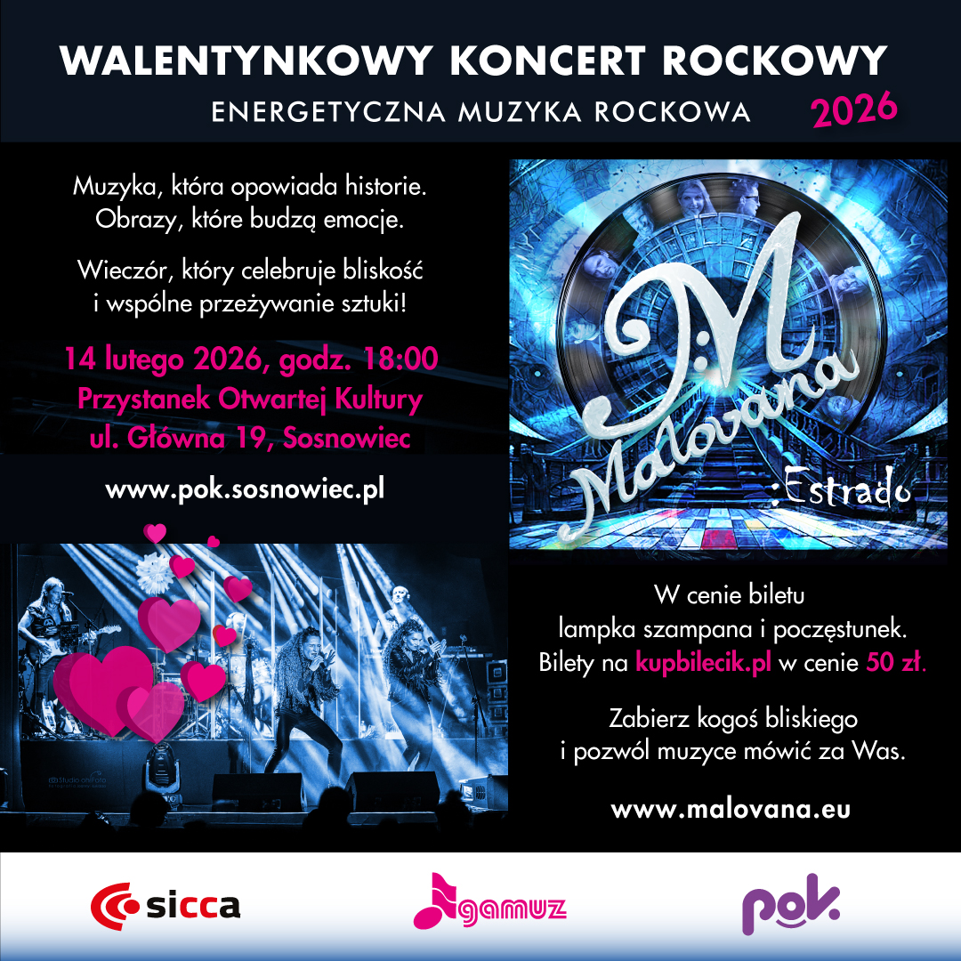 Zapraszamy na wyjątkowe muzyczne doświadczenie, które łączy dźwięk, emocje i sztukę malarską w jedno spójne widowisko. Malovana to projekt i zespół inspirujący się obrazami, grafiką i twórczością artystów wizualnych – ich muzyka nie tylko brzmi, ale opowiada historie ukryte w dziełach sztuki. Podczas koncertu usłyszysz kompozycje, które są muzycznymi interpretacjami inspirującymi się malarstwem i motywami historycznymi. To jak spacer przez galerię, gdzie każdy obraz zamienia się w dźwięk, a każda nuta budzi emocje i obrazy w wyobraźni, to podróż przez barwy, opowieści i nastroje – utwory mówią nie tylko o sztuce, ale i o świecie ludzi, pasji i uczuć. Malovana po swojemu tłumaczy znane i mniej znane dzieła, dzięki czemu muzyka staje się kluczem do nowej percepcji sztuki.